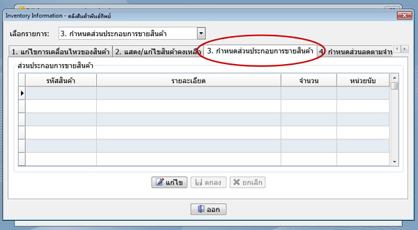 2. จากนั้นให้คลิกที่ "ช้อมูล" หรือกด F3 เลื่อนไปที่แทปรายการ "กำหนดส่วนประกอบการขายของสินค้า"