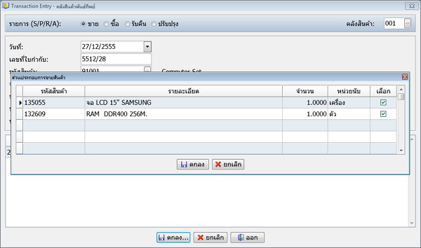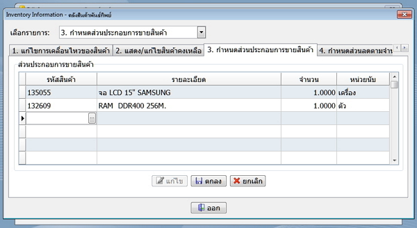 5. เมื่อเรียกรหัสสินค้าที่มีส่วนประกอบมาบันทึกรายการ โปรแกรมจะตัดสต็อคส่วนประกอบของสินค้าตัวนี้ให้โดยอัตโนมัติตามจำนวนที่ได้กำหนดไว้