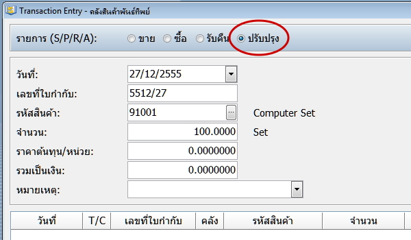 4. ก่อนจะนำรหัสสินค้าที่มีส่วนประกอบมาใช้งาน จะต้องทำการเพิ่มจำนวนสินค้าให้สินค้าหลักก่อน โดยไปที่ Edit>รายการบันทึกประจำวัน ให้เลือกประเภทรายการเป็น "ปรับปรุง" และบันทึกจำนวนตามที่ต้องการลงไป ที่สำคัญคือ ราคาต้นทุนจะต้องเป็น "ศูนย์" เท่านั้น เพราะสินค้าตัวหลักนั้นจะไม่มีอยู่จริง แต่เกิดจากการนำสินค้าหลายๆ ตัวมาประกอบเข้าด้วยกัน