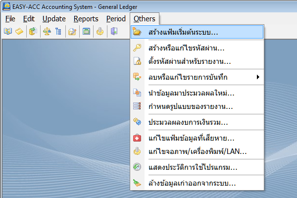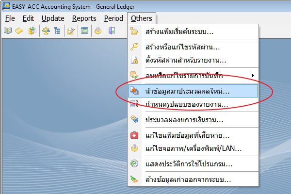 3. กลับมาที่เมนู ไปที่รายการ OTHERS >  นำข้อมูลมาประมวลผลใหม่ ทำการประมวลผลข้อมูลทั้งหมด ตั้งแต่งวดบัญชีแรก จนถึงปัจจุบัน