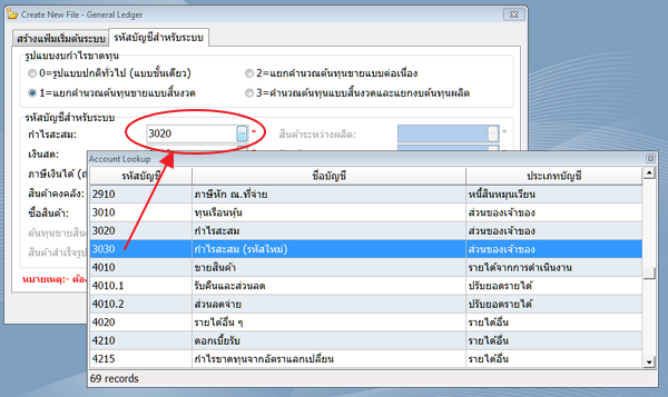2. ให้กด Alt+F9 (จะสังเกตุเห็นว่าในช่องรายการ บัญชีกำไรสะสม เดิมจะไม่สามารถบันทึกได้ แต่เมื่อกด Alt+F9 แล้วช่องรายการจะเปลี่ยนสถานะให้บันทึกได้) จากนั้นให้ กด F1 เพื่อเลือกรหัสบัญชีที่ต้องการ แล้วกด F10 หรือ ตกลง เพื่อทำการบันทึกค่า