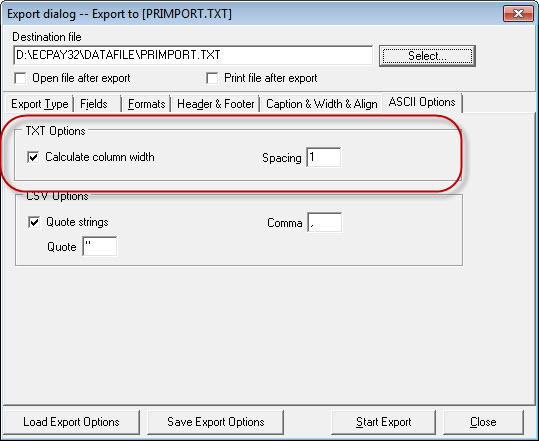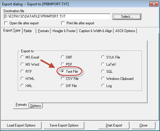 5. เลือกการนำออกข้อมูลในรูปแบบของ Text ไฟล์ และกำหนดชื่อไฟล์ให้เป็น PRIMPORT.TXT จากนั้นในนำไฟล์ที่ Export ออกมาไปไว้ในโฟลเดอร์ที่เก็บข้อมูลของ EASY-ACC Payroll (ปกติจะเก็บไว้ที่ \ecpay32\datafile)
