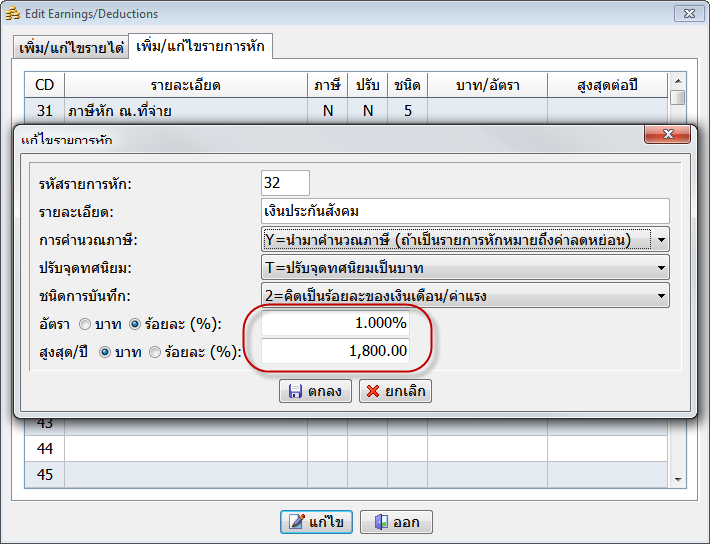 2. เลื่อนแถบแสงไปที่ช่องรายการ "เงินประกันสังคม" แล้วคลิกแก้ไข ให้ทำการบันทึกค่าดังนี้