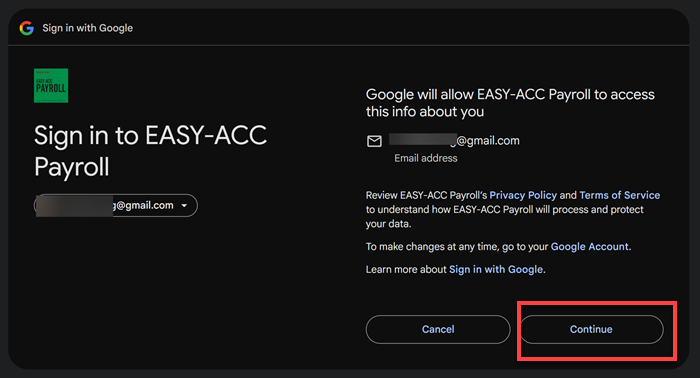 4. ยืนยันการให้สิทธิ์โปรแกรม EASY-ACC Payroll ใช้ส่งอีเมล คลิก Continue