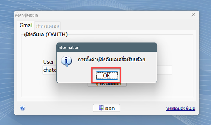 5. เมื่อกลับมาที่หน้าจอโปรแกรมฯ และมีข้อความ การตั้งค่าผู้ส่งอีเมลเสร็จเรียบร้อย ให้คลิก OK