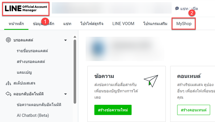 1) เข้าบัญชี Line Shop 2) ไปที่เมนูหลัก โดยคลิกที่โลโก้ Line Official Account Manager และคลิกที่เมนู My Shop