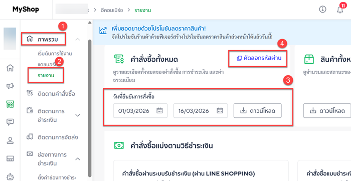 3) เมนูทางด้านซ้ายให้คลิกที่ ภาพรวม > รายงาน > กำหนดช่วงวันที่ที่ต้องการ > คลิกดาวน์โหลด เนื่องจากไฟล์ของ Line Shop จะมีการเข้ารหัสไว้ ท่านจะต้อง คัดลอกรหัส เพื่อนำไปเปิดไฟล์ด้วย