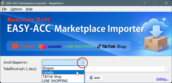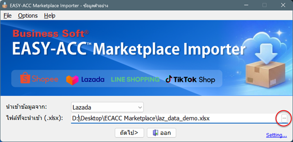 1) หลังจากติดตั้งโปรแกรม จะมี Short Cut EASY-ACC Marketplace Importer แสดงอยู่บน Desktop ของเครื่องที่ติดตั้ง ดับเบิ้ลคลิกเพื่อเรียกใช้งาน
