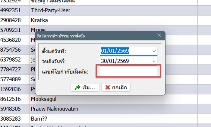 6) กำหนดช่วงวันที่ที่ต้องการนำเข้า กรณีที่ต้องการให้โปรแกรมสร้างเลขที่ใบกำกับให้อัตโนมัติ ท่านสามารถตั้งค่าเลขที่ใบกำกับเริ่มต้นให้กับโปรแกรมได้ และในการนำเข้าครั้งต่อไป โปรแกรมจะ Run เลขใบกำกับให้อัตโนมัติ