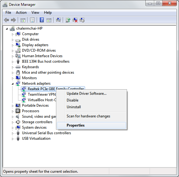 2. เลือก Network และ คลิกขวาที่การ์ด Network ที่ใช้งาน เลือก Properties