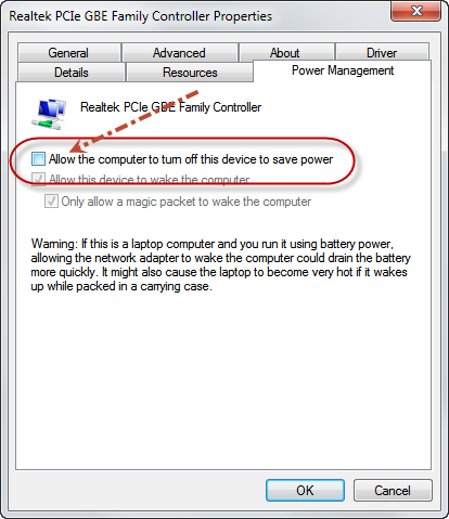 3. คลิกที่แทป Power Management และเอาเครื่องหมายถูกที่ช่อง Allow the computer to turn off this device to save power ออก แล้วคลิก OK