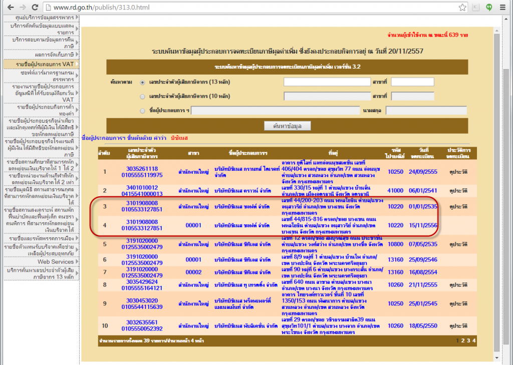 การค้นหาจากชื่อผู้ประกอบการฯ สามารถใส่เพียงบางส่วนก็ได้ เช่น จะค้นหาเลขประจำตัวผู้เสียภาษีของ บริษัท บิซิเนส ซอฟต์ จำกัด ก็ใส่เพียง “บิซิเนส” (ไม่ต้องมีบริษัท ห้าง ร้าน นำหน้า) แล้วคลิกค้นหา ก็จะได้ผลการค้นหาออกมา