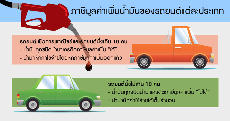 ประเด็นสำคัญที่จะเป็นตัวบอกว่าน้ำมันที่เติมไปนั้นนำมามาเครดิตภาษีมูลค่าเพิ่มได้หรือไม่ คือ “ประเภทรถยนต์” ถ้าเป็นรถเพื่อการพาณิชย์ เช่น รถกระบะ 2 ประตู รถบรรทุก รถยนต์นั่งเกิน 10 คน (รถตู้) น้ำมันที่เติมไปทุกประเภท สามารถนำมาเครดิตภาษีมูลค่าเพิ่มได้ ไม่จำเป็นจะต้องเป็นเฉพาะน้ำมันดีเซลเท่านั้น แต่ถ้าเป็นรถนั่งไม่เกิน 10 คน เช่น รถเก๋ง รถแวน รถ SUV ไม่ว่าจะเติมน้ำมันชนิดใด ก็ไม่สามารถนำมาเครดิตภาษีมูลค่าเพิ่มได้แม้แต่จะเป็นน้ำมันดีเซลก็ตาม แต่สามารถนำมาหักเป็นค่าใช้จ่ายได้เต็มจำนวน (ตามประกาศอธิบดีกรมสรรพากร เกี่ยวกับภาษีมูลค่าเพิ่ม ฉบับที่ 42)
