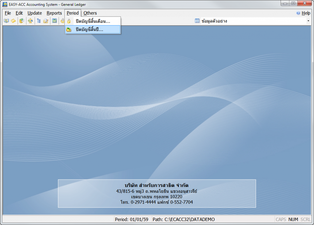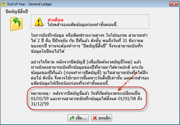 - ทำตามคำแนะนำบนหน้าจอและควรอ่านข้อความให้ละเอียดว่าหลังจากปิดบัญชีแล้ว วันที่เริ่มต้นงวดจะเปลี่ยนเป็น 01/01/59 ถ้าปีมากกว่าแสดงว่าได้ปิดบัญชีไปแล้ว ไม่ต้องทำอะไรต่อ ให้ออกจากโปรแกรมได้เลย