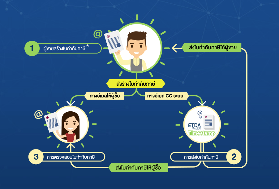 เมื่อท่านเลือกการส่งใบกำกับภาษีแบบ e-Tax Invoice ใบกำกับภาษีใบนั้นจะถูกส่งไปยังอีเมลของลูกค้า และส่งไปยัง ETDA เพื่อประทับรับรองเวลา และจะส่ง e-Tax Invoice ที่ประทับรับรองเวลาแล้ว ไปยังผู้ขายและผู้ซื้อเพื่อยืนยันความถูกต้องอีกครั้งหนึ่ง ทุกขั้นตอนที่กล่าวมานี้ EASY-ACC V2 จะทำงานทั้งหมดแบบอัตโนมัติเพียงคลิกเดียวเท่านั้น