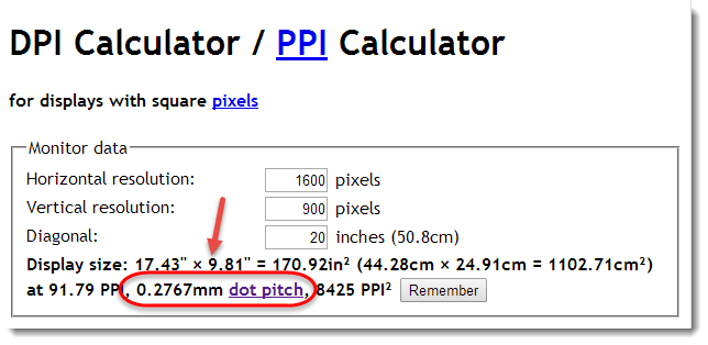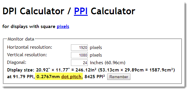 ผมลองใส่ค่า Horizontal resolution และ Vertical resolution เป็น 1920 x 1080 และค่า Diagonal หรือขนาดจอคือ 22 นิ้ว จะได้ค่า dot pitch คือ 0.2537mm หมายความว่า ขนาดตัวอักษรจะเล็กกว่าเมื่อเทียบกับขนาดตัวอักษรที่แสดงบนจอ 20 นิ้ว