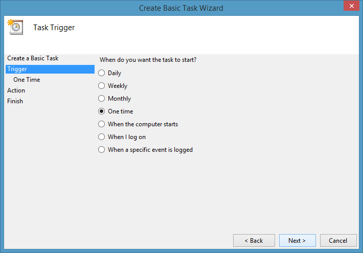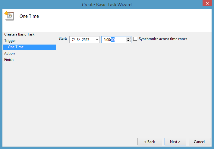 4. เลือกความถี่ที่ต้องการ เช่น ถ้าต้องการให้ปิดเครื่องอัตโนมัติเฉพาะครั้งนี้เท่านั้น ให้เลือก One time แต่ถ้าต้องการให้ปิดเครื่องเองทุกวันตามเวลาที่กำหนด ให้เลือก Daily เป็นต้น ในที่นี่ จะกำหนดเป็น One time เสร็จแล้วกด Next