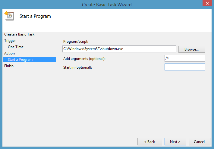 7. ที่บรรทัด Program/script: ให้ใส่ “C:\Windows\System32\shutdown.exe” และบรรทัด Add arguments (optional): ให้ใส่ “/s” เสร็จแล้วคลิก Next และ Finish