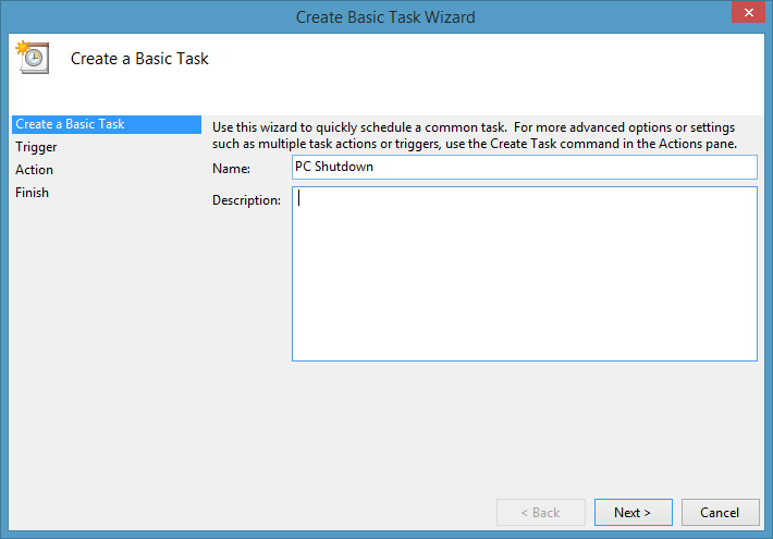 3. ใส่ชื่อและรายละเอียดตามต้องการ ตัวอย่างเช่น “PC Shutdown” เสร็จแล้วคลิก Next