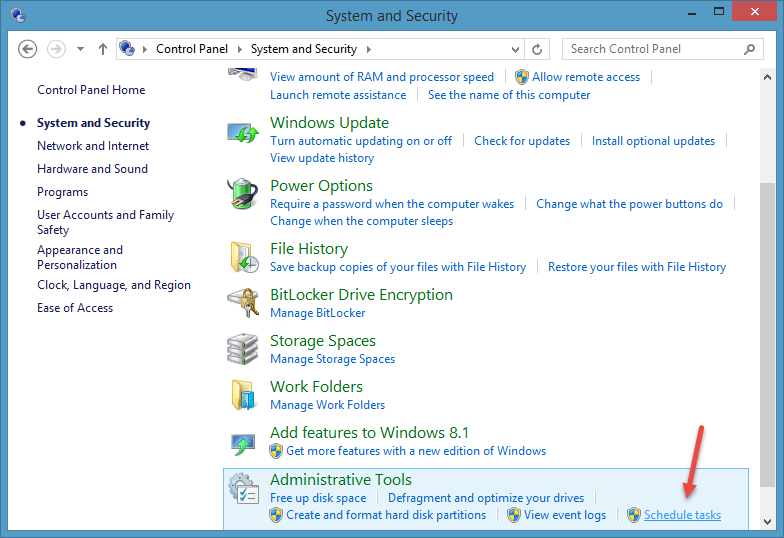 1. ไปที่ Start > Control Panel > System and Security > Administrative Tools และคลิก Task Scheduler (หรือ Schedule Tasks สำหรับ Windows 8)