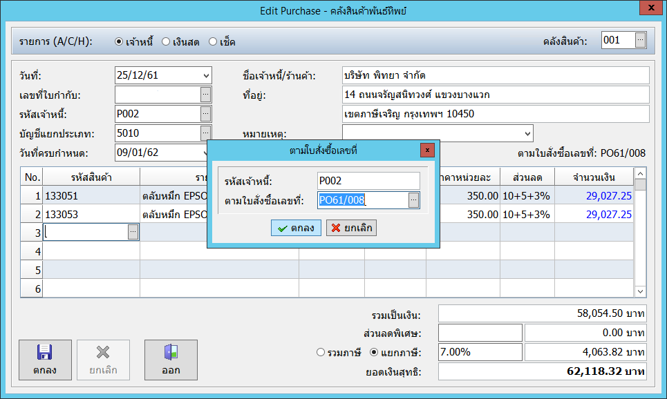 - บันทึกรายการได้ไม่จำกัดจำนวน และสามารถแยกรายการซื้อสินค้าด้วยรหัสบัญชีแยกประเภท