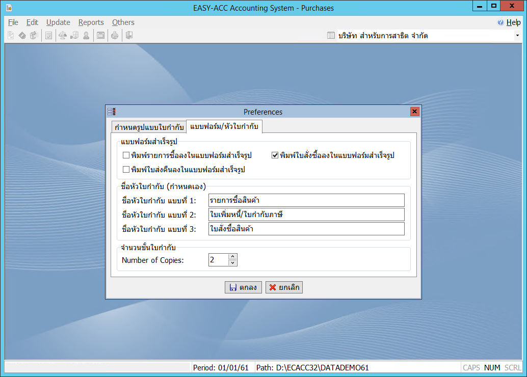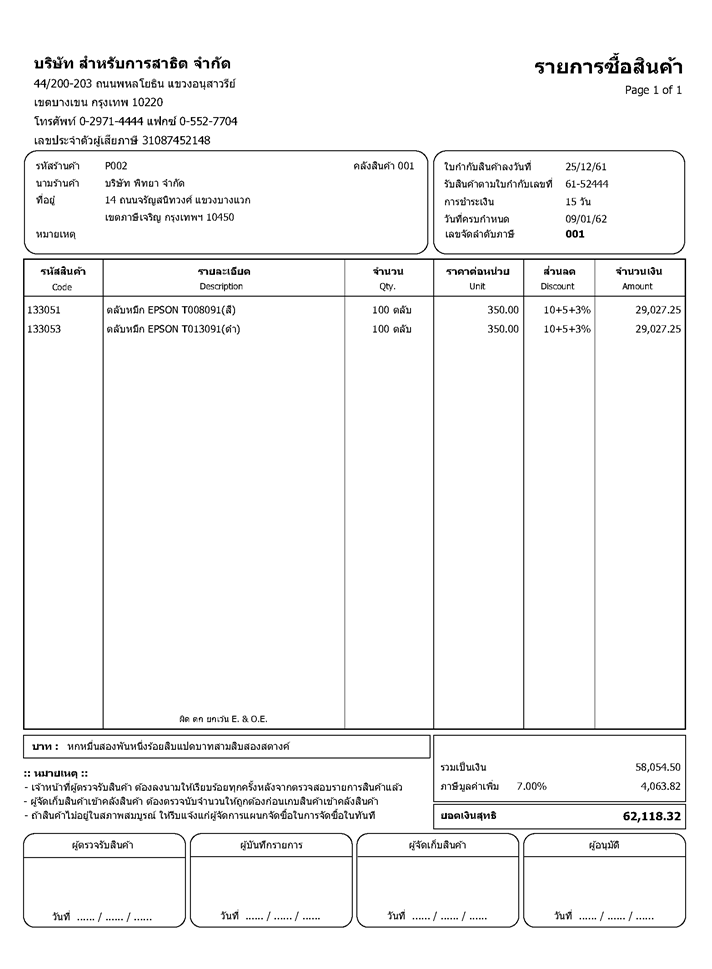 - รูปแบบของใบสั่งซื้อ/ใบซื้อสินค้า/ใบส่งคืน สามารถปรับเปลี่ยนได้ตามต้องการ และยังกำหนดพิมพ์รายการลงบนแบบฟอร์มสำเร็จรูป หรือบนกระดาษเปล่าได้