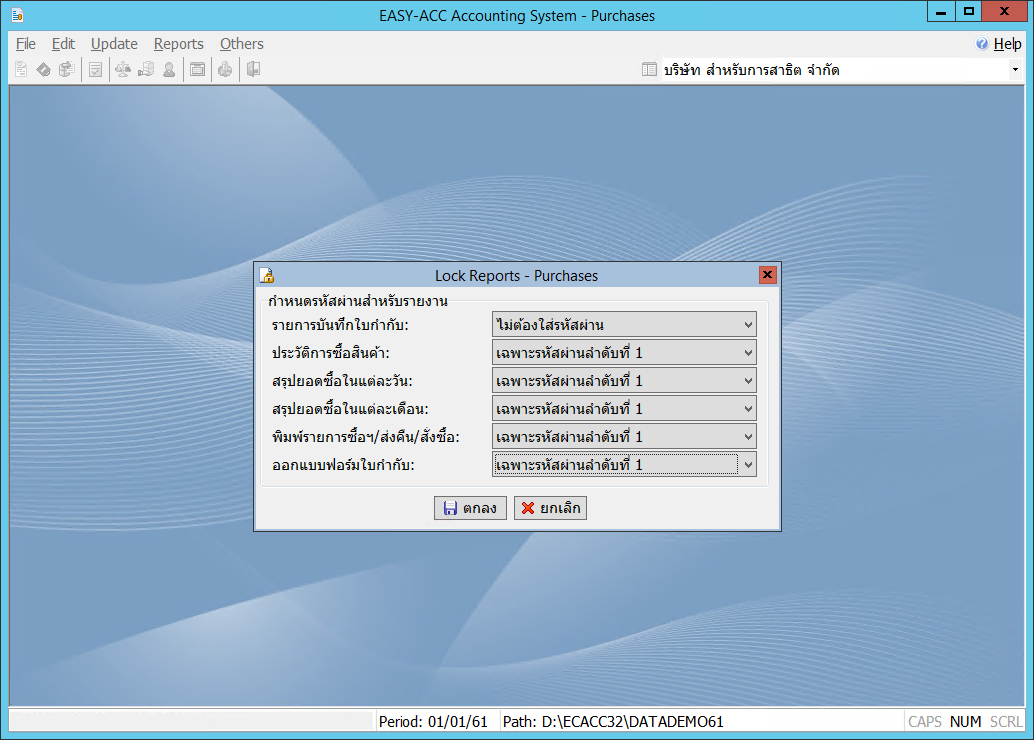 - บันทึกและพิมพ์ใบซื้อสินค้า ใบสั่งซื้อสินค้า ใบส่งคืนสินค้า และสามารถทำการแก้ไข/แทรก/ลบรายการเหล่านั้นได้ ตราบเท่าที่ยังไม่มีรายการขายหลังรายการซื้อ