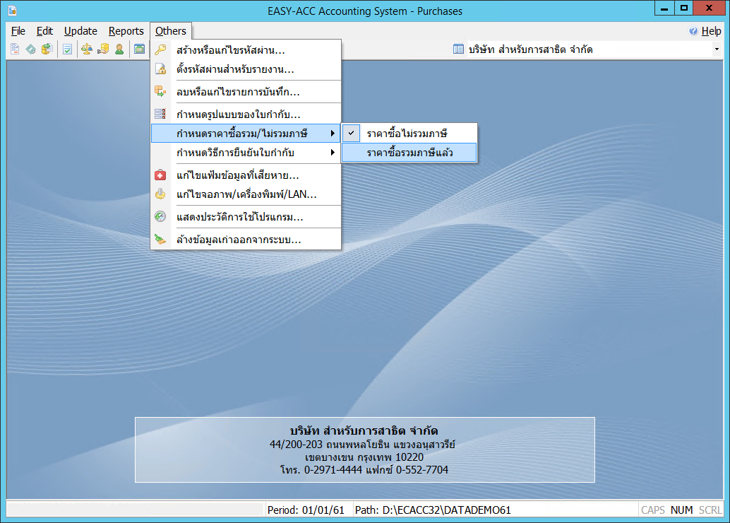 - ภาษีมูลค่าเพิ่มสามารถบันทึกได้ทั้งเป็นจำนวนเงินหรือเปอร์เซ็นต์ และยังกำหนดราคาซื้อเป็นราคารวมภาษี หรือยังไม่รวมภาษีมูลค่าเพิ่มได้