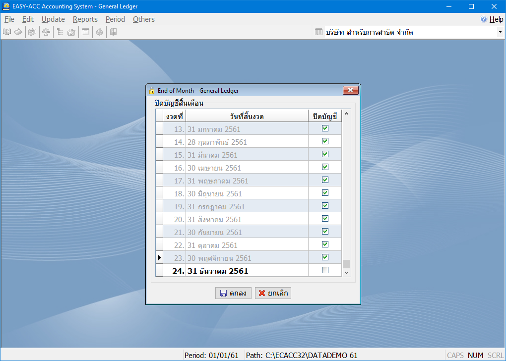 - การปิดบัญชีสิ้นเดือนของโปรแกรม จะเป็นการล็อคการบันทึกในงวดบัญชีนั้นไม่ให้เข้าไปบันทึก หรือแก้ไขในงวดบัญชีนั้น แต่สามารถจะเปิด หรือปิดได้อย่างง่ายได้เพียงเอาเครื่องหมาย "ถูก"ในงวดบัญชีนั้นออกก็สามารถบันทึกรายการได้ตามปกติ(ไม่ใช่การปิดบัญชีตามความหมายทางบัญชีทั่วไป)