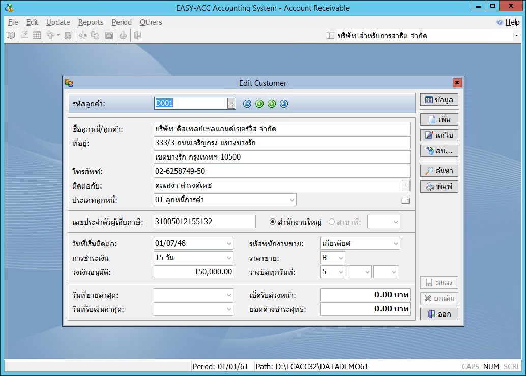 - รองรับรหัสลูกหนี้ได้สูงสุด 10 หลัก และกำหนดประเภทลูกหนี้ได้ 60 ประเภท โดยในแต่ละกลุ่มจะกำหนดรหัสบัญชีคุมลูกหนี้แต่ละประเภท เพื่อโอนเข้าโปรแกรมบัญชีแยกประเภทได้
