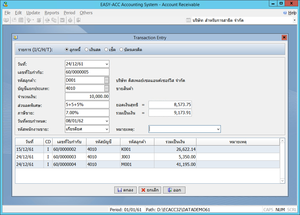 - จอภาพแสดงการบันทึกรายการประจำวัน ซึ่งมีให้เลือกประเภทรายการที่บันทึกเป็นลูกหนี้ เงินสด เช็ค บัตรเครดิต และบันทึกส่วนลดได้หลายระดับได้ เช่น 10+5+2% เป็นต้น