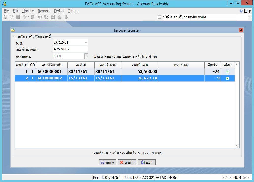 - กรณีที่บันทึกรายการเป็น "ลูกหนี้" สามารถนำมาออกใบวางบิลได้ เพื่อความสะดวกในการทำเช็คสั่งจ่าย ซึ่งกิจการสามารถปรับแก้ไขข้อความต่างๆ ที่แสดงได้เอง