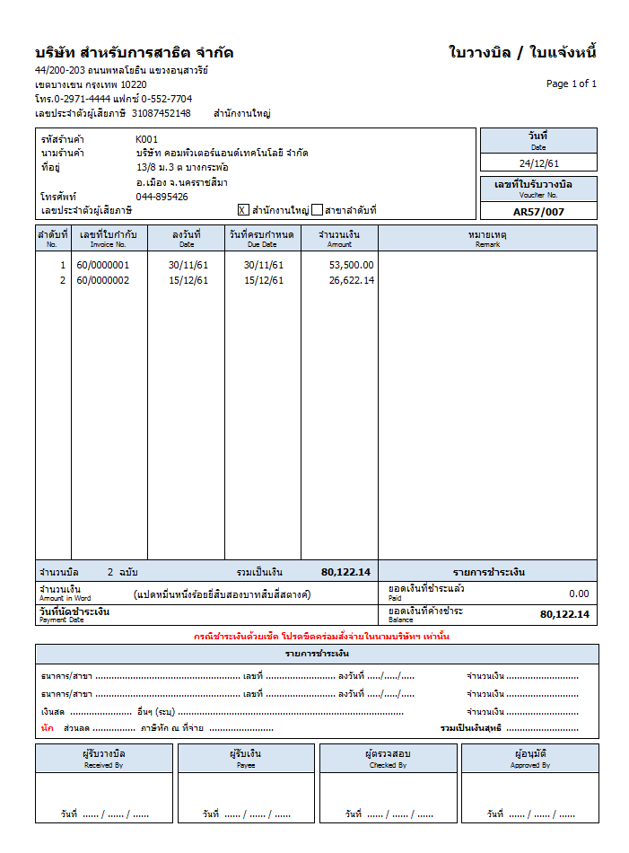 - สามารถรับชำระเงินได้เป็นบางส่วน โดยใบกำกับที่ค้างอยู่นั้นจะถูกตัดออกไป เมื่อชำระครบจำนวนเงินแล้วเท่านั้น