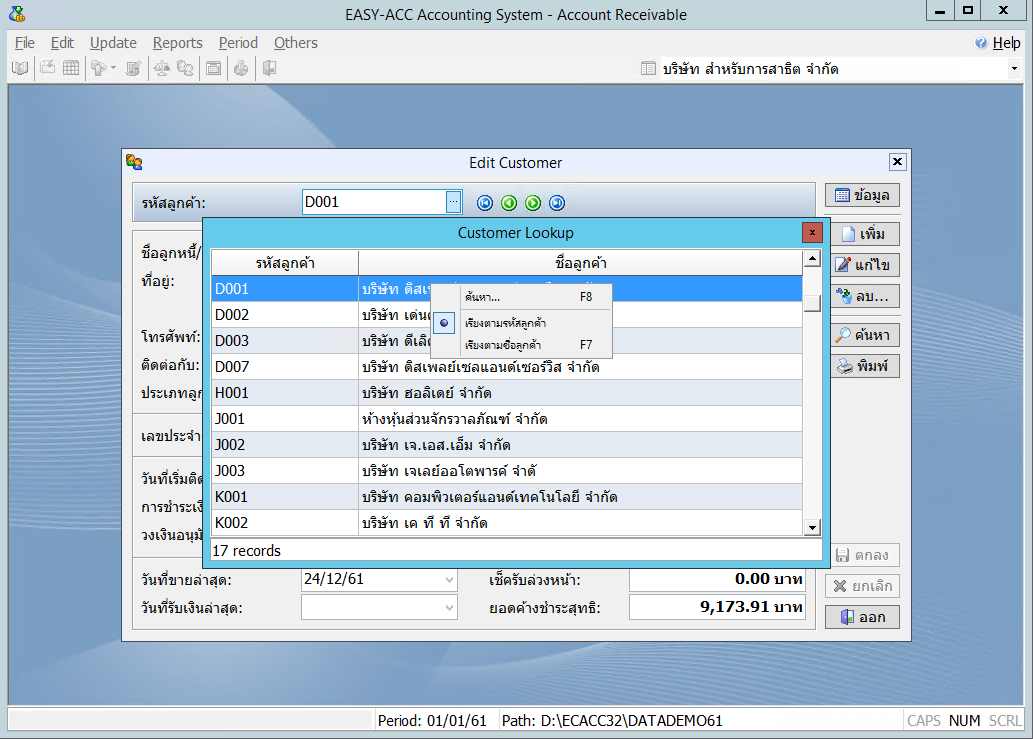 - การค้นหารหัสสามารถกำหนดให้เรียงตามชื่อ หรือตามรหัสได้ และค้นหาได้จากบางส่วนของชื่อ ที่อยู่ เบอร์โทรศัพท์