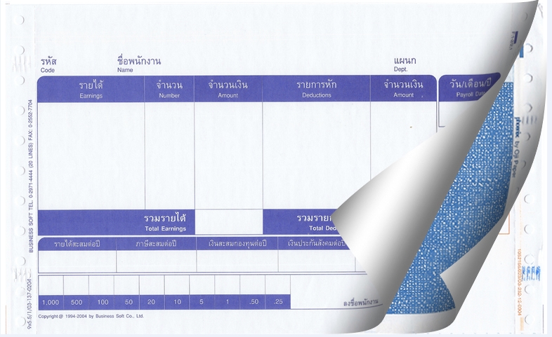 • ใบจ่ายเงินเดือนสำเร็จรูป EASY-ACC (PAYSLIP)  ที่โปรแกรมได้จัดเตรียมไว้นี้ เป็นแบบฟอร์มที่ บริษัท บิซิเนส ซอฟต์ จำกัด เป็นผู้ออกแบบไว้ มีให้เลือกหลายแบบตามความต้องการ ทั้งแบบ ซองเงินเดือน (Enclose) แบบ 3 ชั้น และ แบบฟอร์มใบจ่ายเงินเดือนแบบ 2 ชั้น กล่องละ 500 ชุด