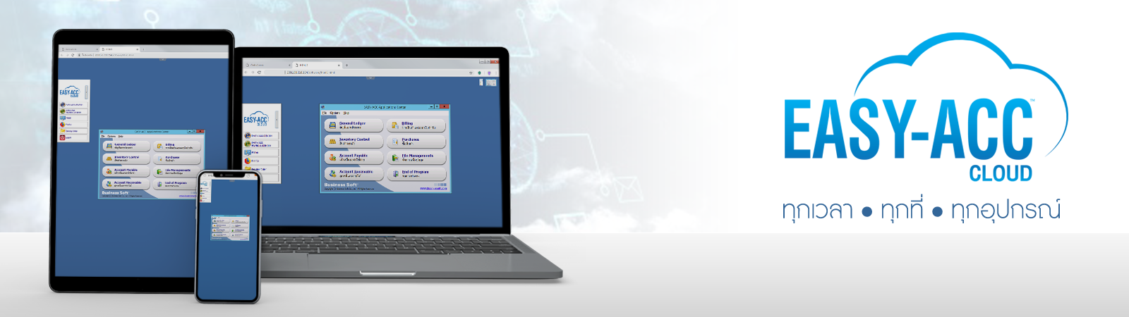 สามารถใช้งานได้บนทุกอุปกรณ์ : คุณสามารถเข้าใช้งาน EASY-ACC Cloud ได้ทุกที่ที่มีการเชื่อมต่ออินเทอร์เน็ต ไม่ว่าจะเป็นบนคอมพิวเตอร์, แท็บเล็ต, หรือโทรศัพท์มือถือ และรองรับระบบปฏิบัติทุกรูปแบบ เช่น Windows, Macintosh, Linux ฯลฯ