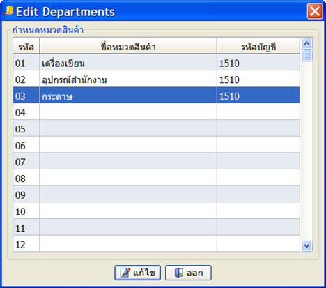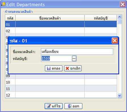 จากจอภาพ Edit Departments ให้เลื่อนแถบแสงไปที่บรรทัดแรก ที่มีตัวเลข 01 แล้วคลิก แก้ไข หรือกด F5 ก็ได้ จากนั้นให้พิมพ์ชื่อหมวดสินค้าเป็น "เครื่องเขียน" ส่วนรหัสบัญชีแยกประเภท ให้ใส่ 1510 หรือกด F1 เพื่อเลือกรหัสบัญชีที่เตรียมไว้ เสร็จแล้วกด F10 หรือคลิก [ตกลง] เพื่อบันทึกข้อมูล
