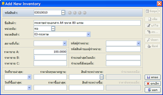 เมื่อจอภาพ Edit Inventory แลสดงขึ้นมา ให้กด F4 หรือคลิกที่เพิ่มก็ได้ สังเกตุตรงมุมซ้ายบนจะเปลี่ยนข้อความเป็น Add New Inventory จากนั้น ก็เริ่มใส่รายการสินค้าลงไป