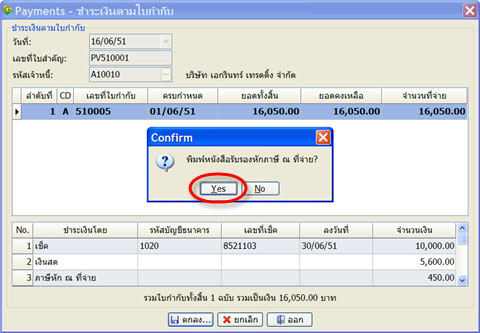 แต่เนื่องจากมีรายการประเภท ภาษีหัก ณ จ่าย โปรแกรม ก็จะให้พิมพ์หนังสือรับรองการหักภาษีฯ ด้วย กด F10