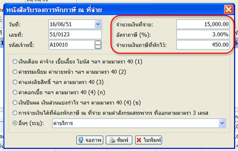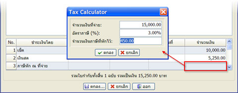 6. ทำตามข้อ 4 อีกครั้ง โดยเลื่อนมาที่บรรทัดที่ 3 แล้วพิมพ์ ชำระเงินโดย เลือกประเภทการชำระเงิน ครั้งนี้ให้เลือกเป็น ภาษีหัก ณ ที่จ่าย ตัวเคอเซอร์ก็จะข้ามไปที่ช่องจำนวนเงินเลย จำนวนเงิน ให้เคาะ Enter 1 ครั้งที่ช่องจำนวนเงิน จะมีกรอบรายการสำหรับคำนวณภาษีหัก ณ ที่จ่ายแสดงขึ้นมา เพื่อช่วยในการคำนวณ จำนวนเงินให้พิมพ์ 15000 อัตราภาษี เท่ากับ 3 โปรแกรมจะคำนวณตัวเลขให้เป็น 450 บาท แล้วกด F10 จำนวนเงินจะมาแสดงในรายการชำระเงินให้เองอัตโนมัติ
