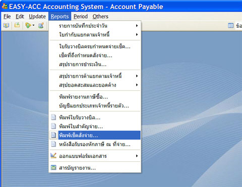 ผู้ใช้สามารถพิมพ์เช็คสั่งจ่ายได้โดยมีขั้นตอน ดังนี้ ไปที่รายการ Report > พิมพ์เช็คสั่งจ่าย