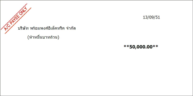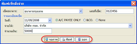 ตัวอย่างเช็คที่จะจัดพิมพ์ออกมา และคลิกที่รูปเครื่องพิมพ์เพื่อพิมพ์เช็ค โดยเช็คที่ใส่ให้ใส่เช็คในแนวตั้ง