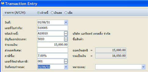 รหัสเจ้าหนี้ (ให้กด F1) เลือก รหัส A10010 (ตามที่ได้สร้างไว้)