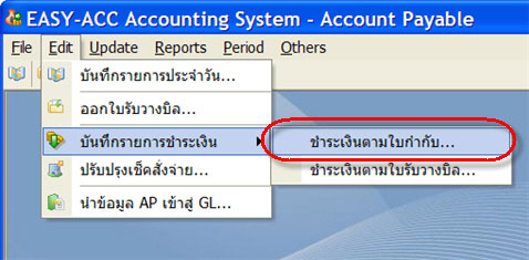 1. เรียกรายการ Edit > บันทึกรายการชำระเงิน > ชำระเงินตามใบกำกับ (หรือตามใบรับวางบิล)