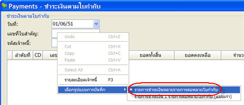 1. เรียกรายการ Edit|บันทึกรายการชำระเงิน เลือกการชำระเงินตามใบกำกับ หรือตามใบรับวางบิล