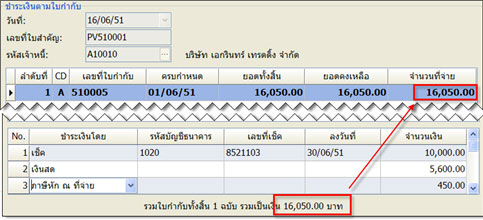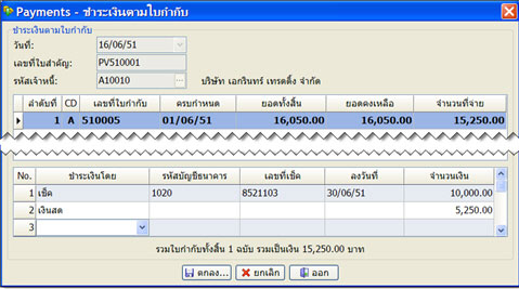 1. รายการชำระเงินหลายรายการต่อหลายใบกำกับ (หรือใบรับวางบิล) การชำระเงินแบบนี้เป็นแบบที่โปรแกรมกำหนดไว้เป็นการชำระเงินหลัก เหมาะสำหรับกรณีที่มีการชำระเงินใน 1 ครั้งชำระพร้อมกันหลายใบกำกับและมีรายการจ่ายชำระหลายรายการในครั้งเดียว เช่น จ่ายชำระใบกำกับรวม 3 รายการด้วยเช็ค 3 รายการ เป็นต้น ลักษณะการบันทึกจะให้เลือกรายการใบกำกับ 1 ใบจากนั้นจึงไปบันทึกรายการชำระเงิน