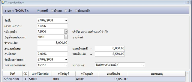 รหัสลูกหนี้ (ให้กด F1) เลือก รหัส A1006 (ถ้ายังไม่ได้สร้าง ให้เริ่มสร้างโดยมีขั้นตอนเดียวกับการสร้างรหัสเจ้าหนี้)