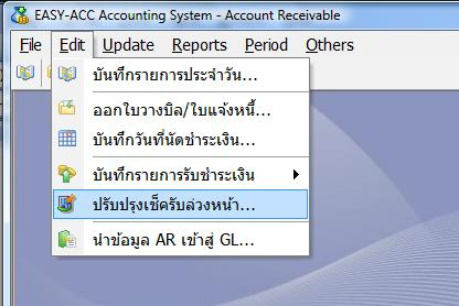 1. เมื่อมีการรับเช็ค กิจการต้องทำการบันทึกรายการของเช็คว่าได้มีการเข้าบัญชีของบริษัทเป็นที่เรียบร้อยหรือไม่ เมื่อเช็คที่ได้รับจากลูกหนี้ได้ทำการเข้าบัญชีเรียบร้อยแล้ว ให้ทำการ บันทึกการปรับปรุงเช็ครับล่วงหน้า โดย เลือก Edit/ปรับปรุงเช็ครับล่วงหน้า