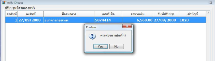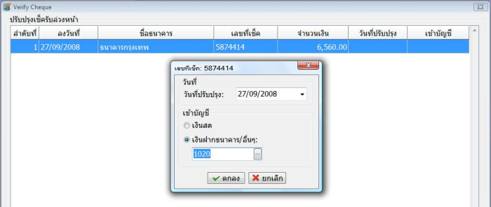 2. ดับเบิ้ลคลิกที่ รายการเช็คที่ต้องการปรับปรุง หน้าจอจะแสดงรายการ สำหรับการบันทึก โดยสามารถบันทึกเป็นเข้าบัญชีเงินสด หรือ เข้าบัญชีธนาคาร ตามรหัสบัญชีที่มีการบันทึกไว้ก่อนหน้านี้ ในที่นี้เลือกเข้าบัญชีเงินฝากธนาคาร