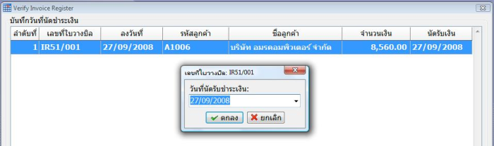 เมื่อพิมพ์ใบวางบิลเพื่อไปรับชำระเงินจากลูกหนี้ ลูกหนี้ก็จะนัดวันรับชำระเงิน กิจการต้องบันทึกวันที่นัดชำระเงิน เพื่อสามารถตรวจสอบได้ว่าวันใดที่ต้องไปรับชำระเงิน เลือก EDIT/บันทึกวันที่นัดชำระเงิน หน้าจอจะแสดงใบวางบิลที่มีการบันทึก ให้ดับเบิ้ลคลิกที่ช่อง นัดชำระเงิน เพื่อบันทึกวันนัดชำระเงิน ในที่นี้ พิมพ์ 27/09/2551 กด [ตกลง] โปรแกรมจะมีการเตือนการบันทึกอีกครั้งเพื่อป้องกันความผิดพลาด จากนั้นเมื่อเลือก [Yes] โปรแกรมจะทำการบันทึกรายการทันที